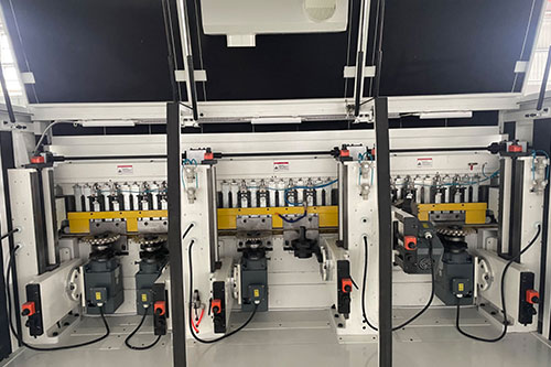 是用來加工地板長邊榫槽的,軸配:它一般分為6軸(實木)、8 軸(復合)10軸(鎖扣)。8 軸設備,前3軸均為水平軸,第4軸為立軸,根據(jù)廠家要求也可以將第3軸設計成既能水平又垂直使用的多用軸,一般是做為倒角使用,;10軸的前4軸基本同于8軸型,只是第5軸為傾斜軸,用來做鎖扣刀軸;刀具與鏈條的***小距離應控制在(2mm)以上,以免損傷刀具及鏈條等。
