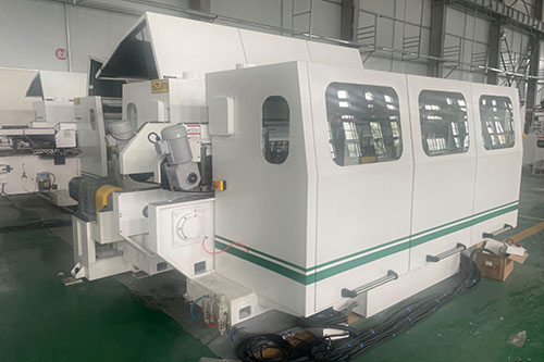是用來加工地板的端頭榫槽的,他一般分為6軸(實木)8軸(復合)10軸、12軸(復合、鎖扣),除第1軸是跳刀軸與縱銑不同外,其余軸與縱銑略同,刀具與鏈條***小距離,以及上壓緊、輔助壓緊裝置也與縱銑相同。